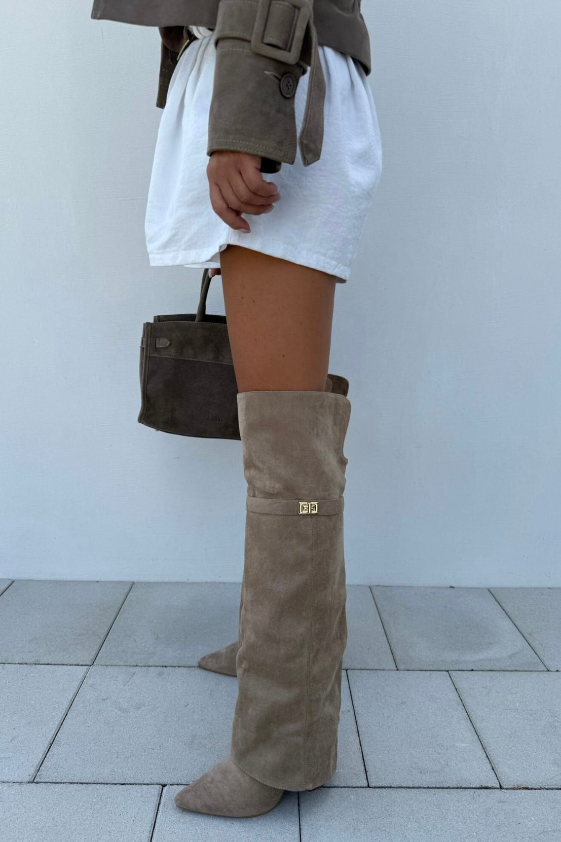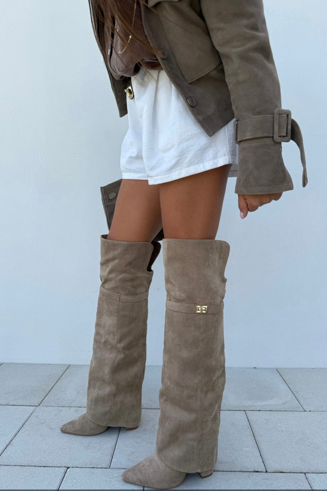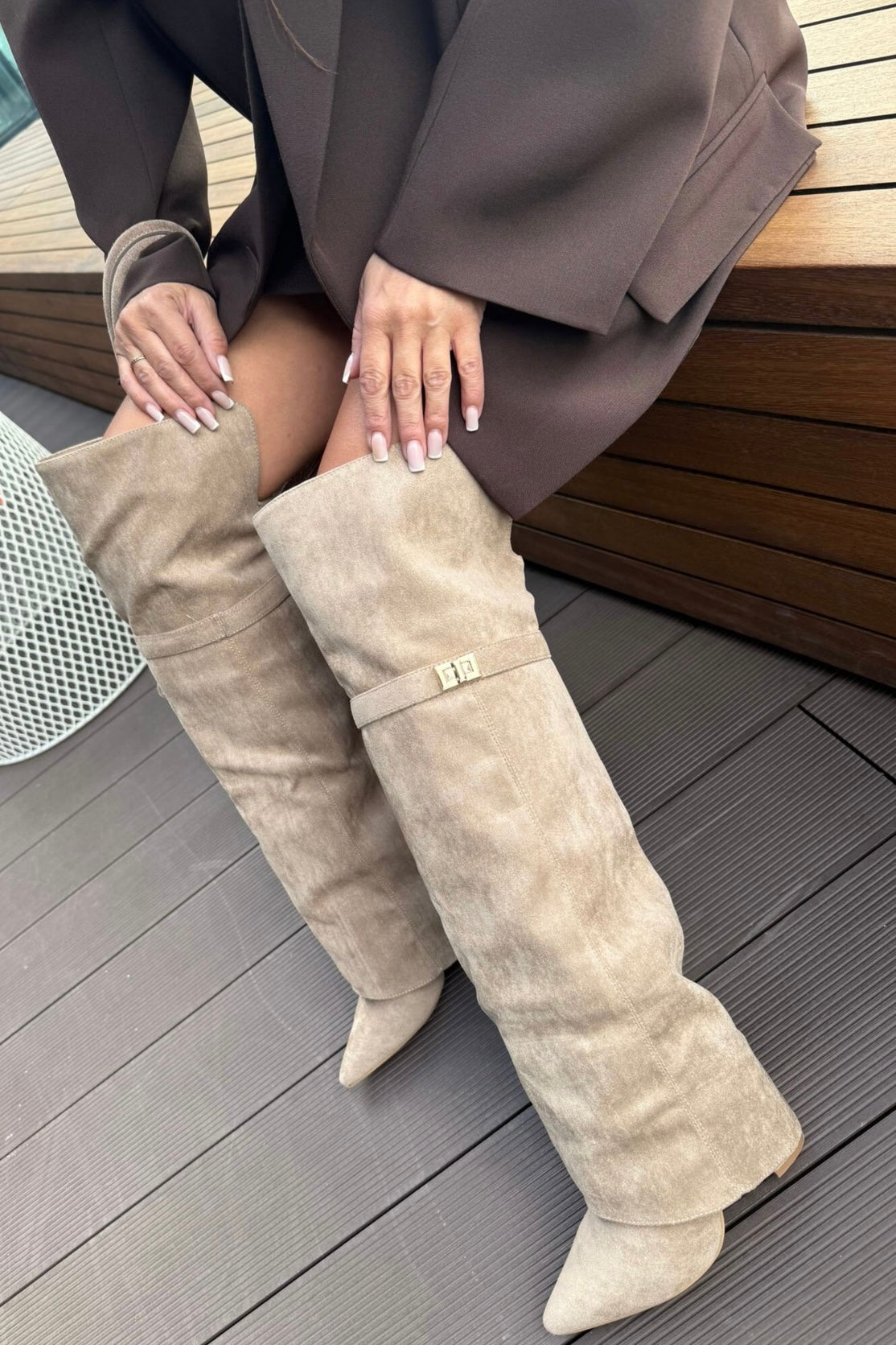 Bota alta a la rodilla cierre interno tipo gamuza con hebilla dorada en costado.